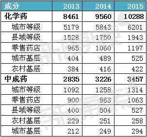 从成分来看(注:未纳入网上药店的30亿元),2015年中成药市场规模达到3457亿元,同比增长7.2%,而化学药销售规模达10288亿元,同比增长达到7.6%。中成药过去多年的相对优势,在2015年出现了逆转。