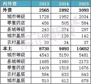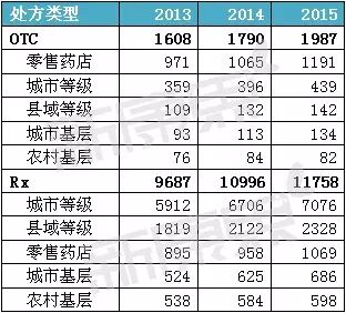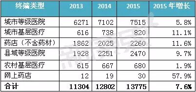 城市等级医院仍是最大的医药终端市场,2015年销售规模为7515亿元,同比增长5.8%,直接拉低了整个医药市场的整体增速。此外,低于整个行业增速的终端还有农村基层医疗市场,2015年市场增长幅度只有1.9%。