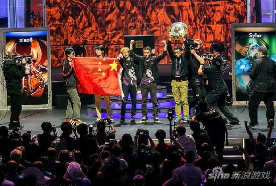 中国的Newbee获得了DOTA2第四届国际邀请赛的冠军,高举中国国旗